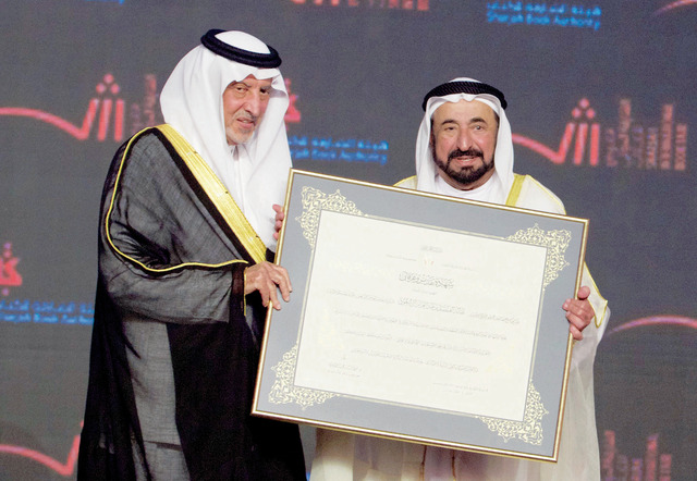 جاء في امتداح مناقب الشيخ سلطان القاسمي على لسان صاحب السمو الملكي الأمير الشاعر خالد الفيصل: شكراً لك أيها الشيخ المثقف باسم كل من ترنم وألف، باسم الكتاب والديوان والقافية والأشجان والمعاني الحسان، شكراً لكل من رشح واختار وفكر ونظم وأدار، وتحية لكل من حرك الحرف إبداعاً، وأضاف لثقافة الإنسان إشعاعاً، وعزف على وتر الكلام إمتاعاً.