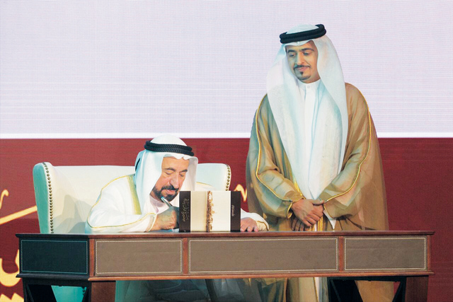 ومنذ تلك اللحظة، وذلك الصعود، أيقن الطفل أن الكتاب والقراءة ترتقي بالإنسان وتسمو به. وشاءت الأقدار أن يكون لذلك الطفل شأن ومنصب بين أهله وشعبه، فأراد لهم ما أراده لنفسه، وما أصبح إيماناً مطلقاً، وحقيقة واضحة لديه، بأن الكتاب هو سبيل الأمم والشعوب للرقي والتقدم. تلك المدينة أنتم فيها الآن، الشارقة، وذلك الطفل، نحن في حضرته الآن، صاحب السمو الشيخ الدكتور سلطان بن محمد القاسمي، عضو المجلس الأعلى حاكم الشارقة.