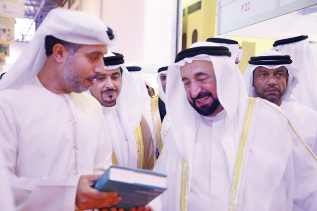 صاحب السمو الشيخ الدكتور سلطان القاسمي، أثناء زيارته لجناح مؤسسة محمد بن راشد آل مكتوم في معرض الشارقة الدولي للكتاب أمس.