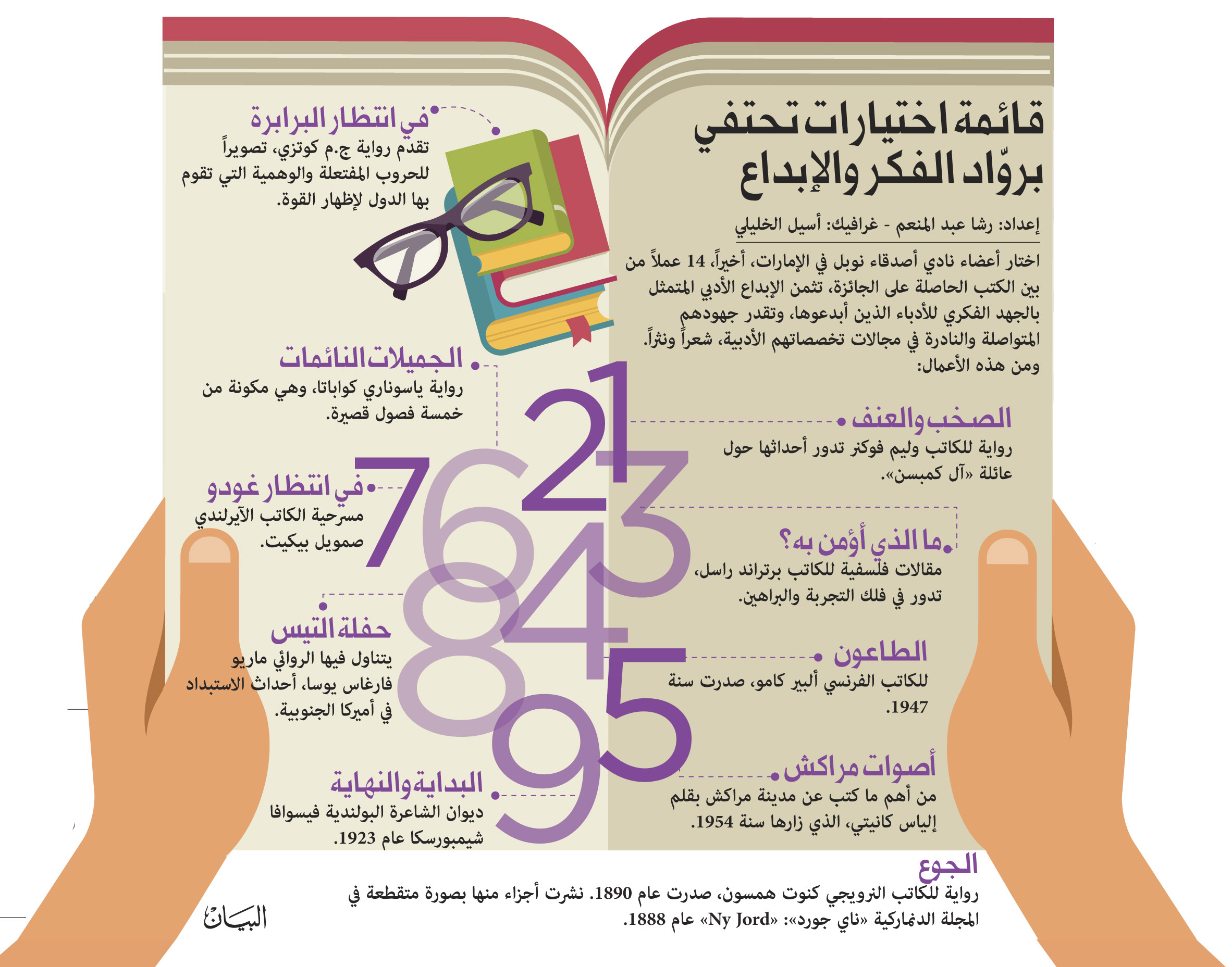 أعلن الأعضاء المؤسسون، لنادي أصدقاء نوبل في الإمارات، عن الخطة القرائية لعام 2016. ذلك خلال جلستهم، أخيرا، في «كتاب كافيه» في دبي، حيث يسعى القائمون على النادي، إلى تكوين حضن ثقافي يسهم في تعزيز التبادل الثقافي والمعرفي بين أفراد المجتمع.