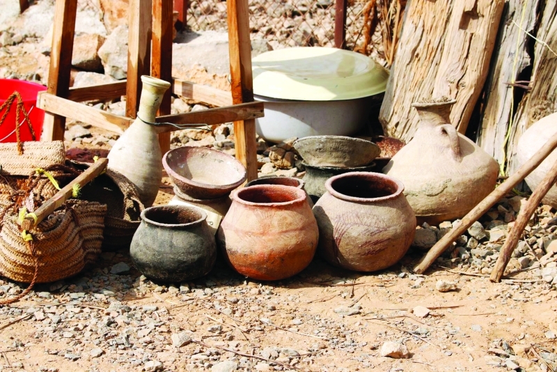إلى جواره كانت تصطف أدوات فولكلورية تستلفت الأنظار، رأينا باباً من خشب سدر قديم، عمره قرون كما يقولون، وثمة حجارة ملح صلبة تزن كيلوغرامين تقريباً وكتلاً من الجبن وتمراً أسود، وكل ذلك في صندوق يعود إلى عقود الستينيات والسبعينيات، يحتفظ بوسعيد بهذه الأشياء الأثيرة إلى نفسه بجانب السعن والبرمة وعدد من الجرار الطينية والقرع اعتزازاً وشغفاً بمكونات الهوية والماضي الجميل الذي يحمل عبق الآباء والأمهات وريعان الصبا.