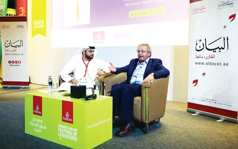 واصل مهرجان طيران الآداب في يومه الثاني فعالياته وأعماله الأدبية المقررة، حيث أقيمت أمس جلستان أدبيتان برعاية صحيفة "البيان"، تحدث في الأولى الروائي الفلسطيني ابراهيم نصرالله عن روايته الأخيرة حرب الكلب الثانية، والجلسة الثانية استضافت الروائي السوري خالد خليفة صاحب رواية "لا سكاكين في هذه المدينة"، وتحدث في الجلسة عن عمله الروائي المقبل عن مدينة حلب في القرن 19 .
