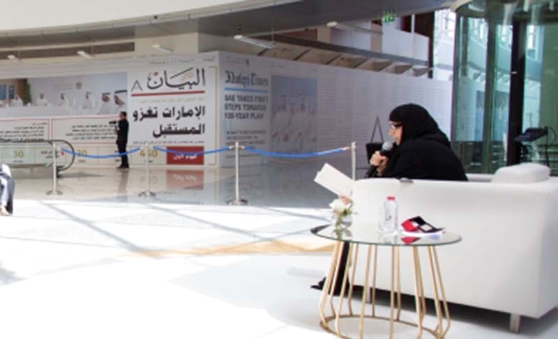 الروائية شيخة الناخي خلال مشاركتها في «ساعة القراءة»، قرأت مقتطفات من مجموعتها القصصية الكاملة «خلجات نفوس حائرة»، وألقت كلمة مؤثرة حول تكريمها من قبل صاحب السمو الشيخ محمد بن راشد آل مكتوم نائب رئيس الدولة رئيس مجلس الوزراء حاكم دبي، رعاه الله، بميدالية أوائل الإمارات.