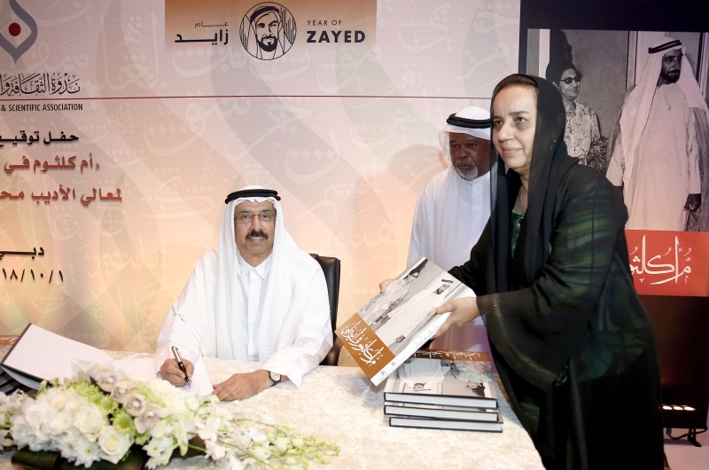 في أمسية احتضنتها «ندوة الثقافة والعلوم» في منطقة الممزر بإمارة دبي، وقّع مساء أول من أمس، وبالتزامن مع فعاليات واحتفالات دولة الإمارات المستمرة بعام زايد، معالي محمد المر، رئيس مجلس أمناء مكتبة محمد بن راشد، كتابه «أم كلثوم في أبوظبي»، الصادر عن الأرشيف الوطني في إمارة أبوظبي، والذي يستعرض زيارة «أم كلثوم» لإمارة أبوظبي عام 1971، للمشاركة في الاحتفالات الشعبية التي أقيمت، حينذاك، بمناسبة مرور 5 سنوات على تولي المغفور له بإذن الله تعالي الشيخ زايد بن سلطان آل نهيان طيب الله ثراه، مقاليد الحكم بإمارة أبوظبي، وأيضاً قيام اتحاد دولة الإمارات العربية المتحدة، حيث تعتبر أم كلثوم الملقبة بـ«كوكب الشرق» أحد أبرز وأهم الرموز الغنائية في العالم العربي، كما كان يحرص محبو فنها من دولة الإمارات وخلال فترة الستينيات على السفر إلى القاهرة لحضور حفلاتها الفنية، وشكلت زيارتها في تلك الفترة حدثاً استثنائياً، وشدت بعدد من أجمل أغانيها.