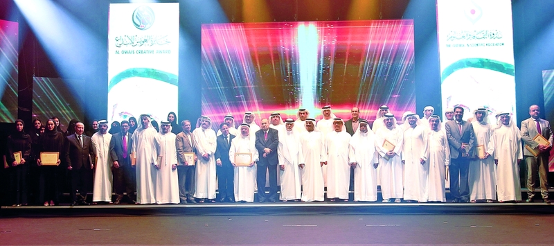 احتفت ندوة الثقافة والعلوم في دبي، أول من أمس، بالفائزين في جائزة العويس للإبداع بدورتها السادسة والعشرين، ضمن احتفالية كبيرة، كرم خلالها معالي الدكتور المهندس عبد الله بن محمد بلحيف النعيمي وزير تطوير البنية التحتية، معالي الفريق ضاحي خلفان تميم نائب رئيس الشرطة والأمن العام في دبي، وإبراهيم بو ملحه مستشار صاحب السمو حاكم دبي للشؤون الإنسانية والثقافية، والمستشار والمؤرخ جمال بن حويرب المدير التنفيذي لمؤسسة محمد بن راشد آل مكتوم للمعرفة، والكاتب عوض بن حاسوم الدرمكي، والكاتب سلطان العميمي مدير أكاديمية الشعر في أبوظبي، وكافة الفائزين الآخرين، وذلك بحضور معالي محمد المر رئيس مجلس أمناء مكتبة محمد بن راشد، ومعالي سعيد الرقباني المستشار الخاص لصاحب السمو حاكم الفجيرة، وعبدالله حميد علي المزروعي رئيس مجلس إدارة صندوق ثامر للتكافل التعليمي التابع لجامعة عجمان، وهالة بدري مدير عام هيئة دبي للثقافة والفنون وسعيد النابودة المدير التنفيذي لقطاع الثقافة والتراث في "دبي للثقافة والفنون"، والأديب محمد القرق، وعدد كبير من الحضور والمهتمين.