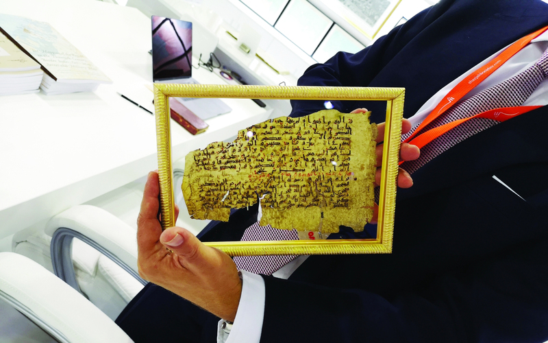 يحتضن معرض الشارقة الدولي للكتاب في دورته هذا العام أقدم المخطوطات القرآنية التي تم العثور عليها حتى يومنا هذا، وتضم صفحة واحدة من القرآن الكريم، وتبيّن بفحصها بتقنية الكربون المشع أن عمرها يتجاوز 1300 عام؛ وتعود تحديداً إلى بدايات القرن الهجري الثاني، الذي يوافق القرن الثامن الميلادي، في عصر الخلافة الأموية. وقُدّر أن تاريخها يعود إلى الفترة الواقعة بين عامي 715 و740 ميلادي بنسبة دقة 95%.