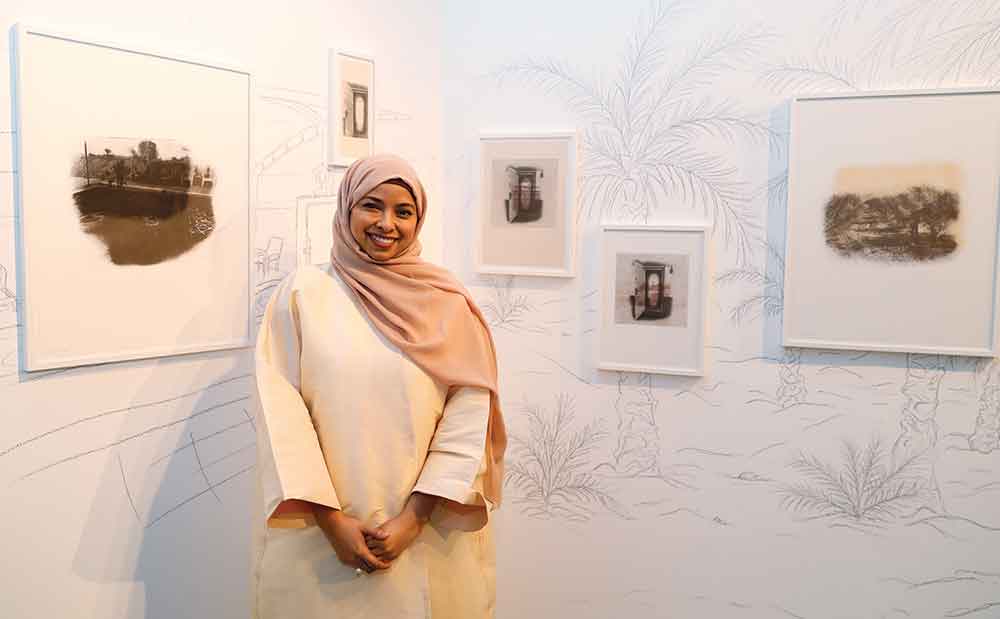 وتشير الفنانة سلامة نصيب، التي تحمل درجة الماجستير في الطباعة من الكلية الملكية للفنون في لندن بالمملكة المتحدة، وشاركت في معارض مختلفة في أماكن محلية ودولية، إن أعمالها التي يتضمنها المعرض ترتكز على البوم صور عائلتها، فمجرد وصولها إلى «مركز دندي للفنون المعاصرة» كانت تتطلع إلى مواصلة استكشاف الموضوعات الفنية في محور الذاكرة، وخلال تفحص الصور الممسوحة ضوئياً من تلك الألبومات التي التقطتها في أوائل التسعينيات من القرن الماضي في مزرعة العائلة بمدينة رأس الخيمة، والتي كانت بمثابة منزل صيفي للعائلة.
