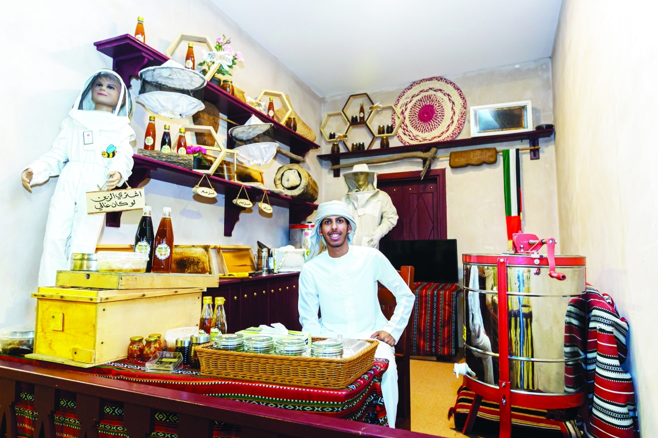 وثمة محل يعرض مجموعة من عسل السمر والسدر والغاف الإماراتي ذي الجودة العالية، معرفاً الزوار بمناطق وجود هذه الأنواع والمناحل والأدوات المستعملة في استخلاص العسل وطرق تصفيته وعصره. ويستمتع زوار الجناح بالتقاط صور تذكارية بالزي الإماراتي القديم في الاستوديو الذي يعرفهم بطرق وآلات التصوير القديمة، وكذلك الاستمتاع بحمل الصقور والتعرف عليها عن قرب والتقاط صور تذكارية معها والتعرف على أنواعها وطرق تربيتها.