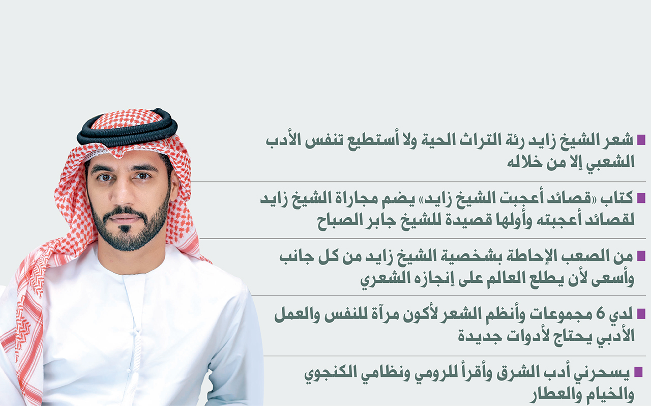 إن شعر الشيخ زايد «رحمه الله» رئة التراث الحية، ولا أستطيع أن أتنفس الأدب الشعبي إلا من خلاله، لذلك اختصت إصداراتي لأكثر من 10 سنوات بنشر «دراسة تحليلية في شعر الشيخ زايد»، وعملت على جمع قصائده التي لم تجمع إلى الآن في كتاب واحد، بجانب 3 كتب نشرتها عن شعره، وما زال في جعبتي إصدارات أخرى تخصّ شعر الشيخ زايد، وأسعى لنشرها خارج الإمارات؛ لأكون سفيراً يحمل تلك الإبداعات والمعاني المضيئة إلى الآخر، فالعالم يعرف الشيخ زايد كرجل دولة ورجل سلام وسخاء، لكنه غير مطلع على الجانب الأدبي من هذه الشخصية التاريخية المهمة.