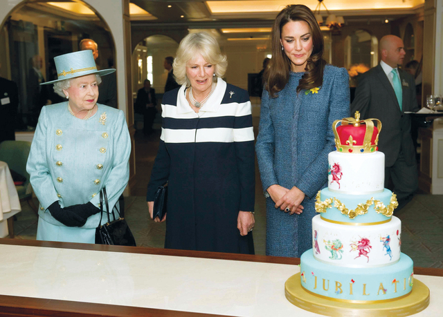 كعكة «رويترز»كاثرين ميدلتون دوقة كامبريدج تنظر إلى كعكة اليوبيل الفضي لمحلات «فورتيم آند ميسون» للأغذية في لندن.
