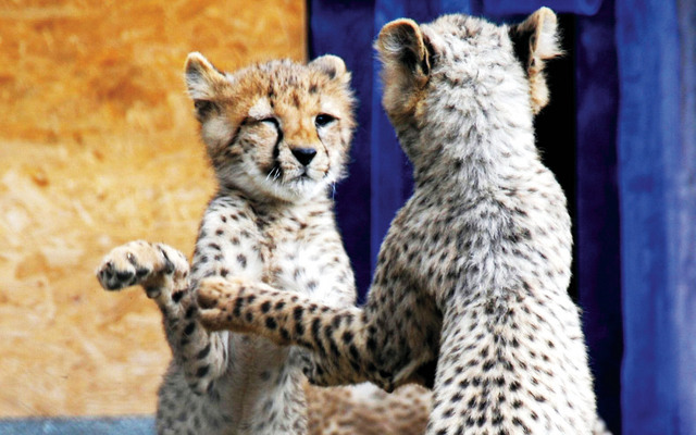 حدائق (ا ف باثنان من فصيلة الفهود الشباب التي تعتبر من الأنواع النادرة يلهوان في حديقة للحيوان في منطقة نيوويد بألمانيا، أمس. )