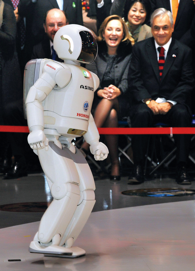 لقطة (أ ف ب)الروبوت الياباني "أسيمو"، الذي يوصف بالآلة الخارقة، يقدم عروضاً راقصة، أمس في متحف العلوم في طوكيو، أمام الرئيس التشيلي سيباستيان بينيرا وزوجته سيسيليا موريل، واللذان يقومان بزيارة إلى اليابان تستغرق أياماً عدة.