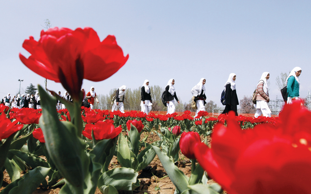 ربيع كشمير «إيه بي أي»طالبات كشميريات في طريقهن إلى مدرستهن عبر طريق زراعي حفته الورود الحمراء، معلنة بداية فصل الربيع.