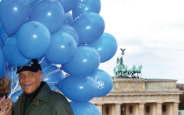 حملة رويترزالمغني والممثل الاميركي وسفير اليونيسيف هاري بيلافونت يحمل بالونات هواء ذات اللون الازرق في أكاديمية الفنون في العاصمة الالمانية برلين، في إطار حملة تنظمها اليونيسيف عن مياه الشرب النظيفة. ( )