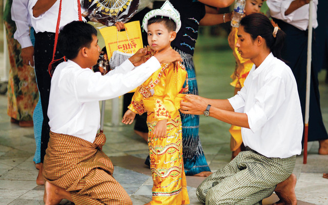 مساعدة (رويترز)طفل يرتدي الملابس التقليدية لحضور احتفال في يانغون عاصمة ميانمار يساعده اثنان من الموظفين في أحد المحال التجارية بترتيب هندامه لكي يظهر بشكل لائق ومقبول.