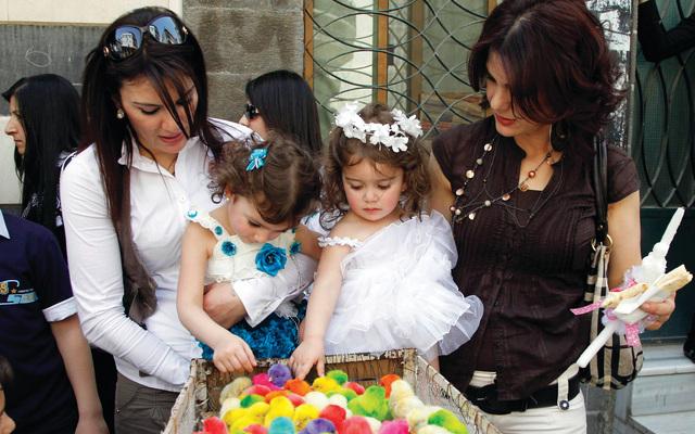 كتاكيت العيد (رويترزسيدات يحملن أطفالهن وينظرن إلى كتاكيت ملونة عقب حضور احتفال بعيد الفصح في أحد أحياء دمشق القديمة أمس.)
