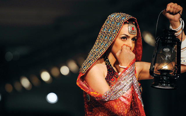 عارضة أزياء باكستانية تقدم زياً مختلفاً وغريباً يضفي عليها بعض التميز، حيث تحمل في يدها فانوساً مضيئاً من إبداع حنيجيفت يونيفرستي، في أول أيام أسبوع إسلام أباد للموضة، أمس، ويسعى معرض الأزياء إلى تعليم وتمكين وتشجيع المصممين على الترويج للحرف اليدوية . )