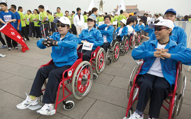 منافسة بألوان موحدة أيه بي أي)متسابقون من ذوي الاحتياجات الخاصة نساء ورجال وبألوان موحدة يشاركون بسباق الكراسي المتحركة في افتتاح مهرجان بكين الدولي في العاصمة الصينية، ويتوقع المنظمون أن يصل عدد المتسابقين إلى 20 ألف متسابق في هذا الماراثون. (