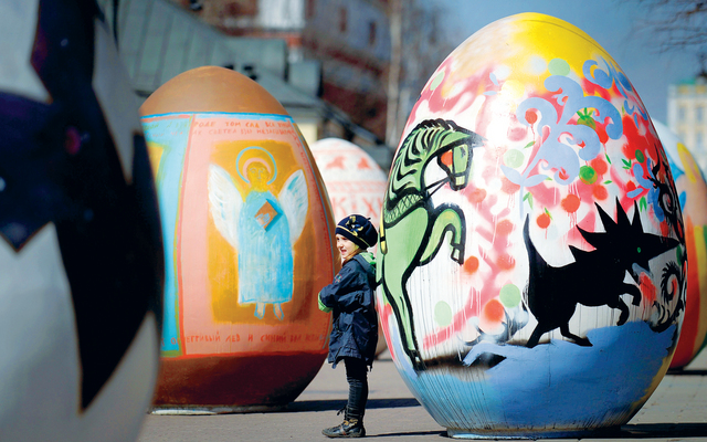 ألوان ( أ ف بطفلة روسية تقف بجانب إحدى البيضات الملونة العملاقة في وسط موسكو، حيث عمت الاحتفالات بعيد الفصح التي يلجأ فيها الناس إلى تلوين البيض العملاق، ومن جميع الأحجام، بهذه المناسبة الدينية لدى الطوائف المسيحية. )