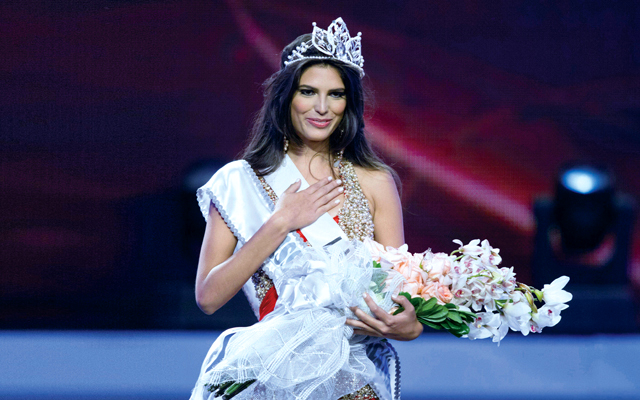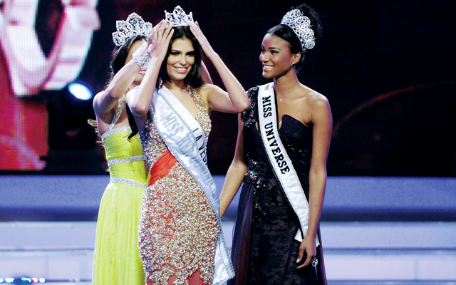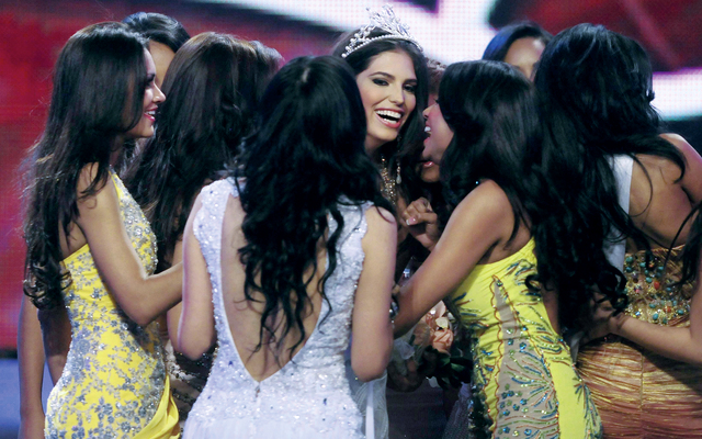 تتويج (الوكالات)كارولينا دوران لحظة إعلان تتويجها ملكة جمال بلدها الدومينيكان 2012، أول من أمس في العاصمة سانتو دومينغو، حيث حلقت حولها وصيفاتها المشاركات في المسابقة يهنئنها على اللقب.