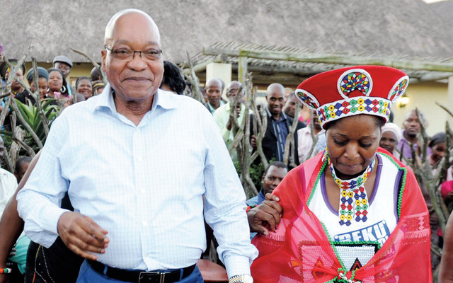 طقوس أ ف ب)الرئيس الجنوب إفريقي جاكوب زوما برفقة زوجته الجديدة نغيما بونغي، يؤديان طقوساً فلكلورية تقليدية في مراسم زفافهما في مدينة ناكاندلا، أول من أمس، في حفل ضم المقربين من العريسين. يشار إلى أن هذه هي الزيجة السادسة للرئيس الذي يبلغ من العمر 70 عاماً. (