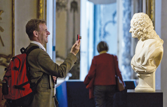 لقطة (رويترزرجل يلتقط صورة لتمثال نصفي من فولتير في معرض فني، يوم أمس في مدينة بوتسدام الألمانية، ويشمل المعرض أعمالاً عن القصور والحدائق البروسية، ويأتي المعرض احتفالا بالذكرى 300 لميلاد الملك البروسي فريدريك الكبير. )