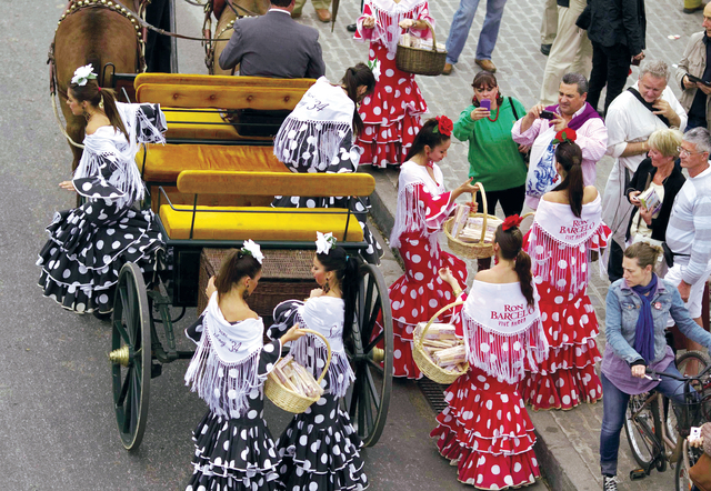 نساء إشبيلية (رويترز)نساء إسبانيات يوزعن الورود على المارة، الذين وقفوا لالتقاط صور لهن، في احتفالية، ضمن مهرجان تقليدي نظم في مدينة إشبيلية، وتجول النساء في المهرجان بملابس خاصة وهن على عربات تجرها الخيول.