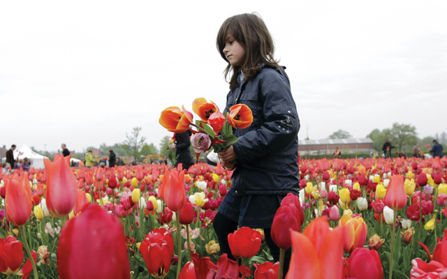قطف التوليب ( أ بتنتشر في بلجيكا حقول زهور التوليب الصفراء، وقد تم اختيار عام 2012 ليكون عام زهور التوليب حيث تقام الاحتفالات في هذه المناسبة ودعوة مجانية للجمهور لزيارة الحقول وقطف ما يشاء من هذه الزهور مجانا وفي الصورة طفلة تقطف الخصلات من أحد الحقول الواسعة. )