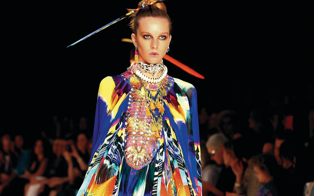 أزياء (ا ف ب)عارضة أزياء ترتدي فستان سهرة يمتاز بألوانه المزركشة التي تغلب عليها البهجة والرومانسية من إبداع كاميلا خلال أسبوع الموضة المقام حالياً في العاصمة الأسترالية سيدني أمس.