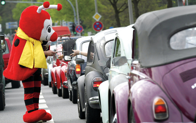 ترويج ( أ ب )رجل يرتدي زي حشرة يوزع منشورات على المشاركين في اجتماع لأصحاب وهواة سيارات فولكس فاغن في مدينة هانوفر وصل نحو 3000 من أصحابها من مختلف أنحاء أوروبا لحضور الاجتماع .