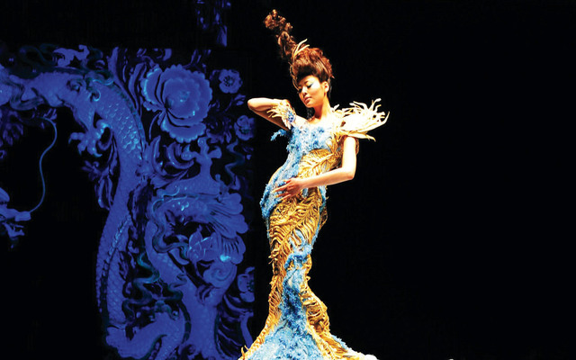 أزياء أ ف ب)عارضة أزياء تقدم زياً مبتكراً لفستان ليلة الفرح، في مهرجان تصميم أزياء الأعراس، المقام حالياً تحت عنوان: «عرائس قصة التنين الصيني» في العاصمة الصينية بكين. (