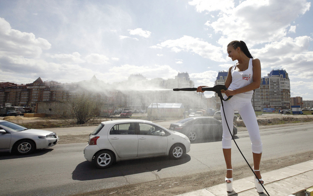 ترويج بالمياه ( رويترزمندوبة مبيعات في معرض سيارات تقف على جانب الطريق حاملة بين يديها خرطوم مياه ترش به المركبات المارة وذلك في إطار عمل ترويجي للمعرض السنوي بمدينة سيبيريا الروسية، الذي يعتبر أكبر مهرجان سنوي للسيارات يقام سنوياً في سيبيريا. )