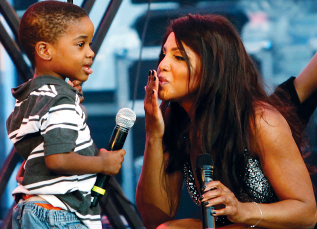 غناء (رويترز)المغنية الأميركية توني براكستون، تطبع قبلة على خد فتى دعته إلى المسرح أثناء تقديمها حفلة لدى مشاركتها في الفعاليات الختامية لمهرجان الجاز 21 في سانت لوسيا.