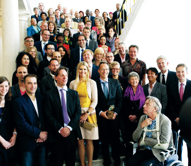 بسمة التكريم (أ ب أ)الأميرة ماكسيما صاحبة البسمة التي لا تفارق وجهها، وخلفها مباشرة زوجها الأمير ويليام ألكسندر ولي عهد هولندا، يتقدمان مجموعة من المكرمين خلال حفل توزيع الجوائز في قصر نوردياند في مدينة لاهاي الهولندية.