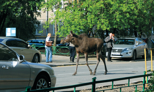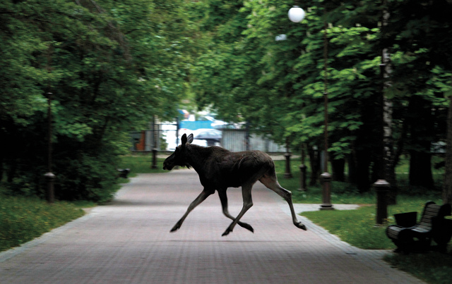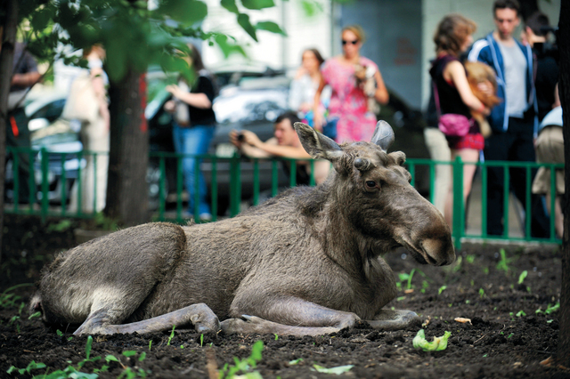 تفاجأ الناس، أول من أمس، في ضاحية أيسترن، شرق العاصمة الروسية موسكو، بأيل شارد يتجول في الشوارع بذهول، فيما اقتنص استراحة في إحدى الحدائق العامة، حين استبد به التعب، حيث تحلق حوله جمع غفير من الناس يلتقطون الصور له. ويرجح أن يكون متسللاً من إحدى محميات الأيائل القريبة. )