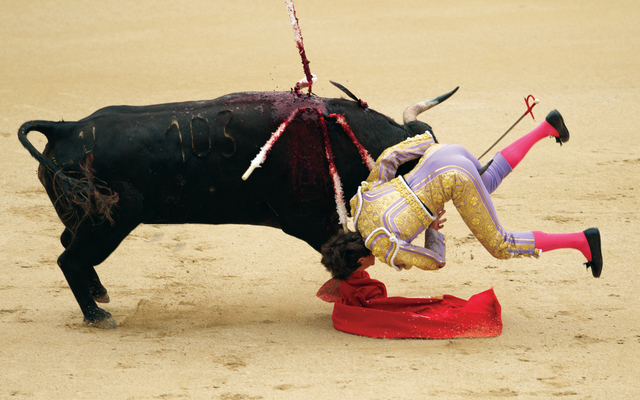لقطة (أ ب)مصارع الثيران الفرنسي سباستيان كاستيلا، على قرون ثور، أول من أمس، في مهرجان لمصارعة الثيران، في مدريد، وقد أصيب بعد المواجهة العنيفة مع الثور بجروح، كانت ستكون أبلغ، لولا تدخل فرق شغلت الثور عن تمزيقه.