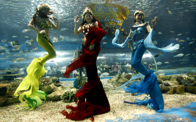 حوريات البحر ( رويترز )غواصات محترفات يرتدين أزياء حوريات البحر يقدمن عروضا تحت الماء في مهرجان (زهور مايو ) في حديقة المحيط بمناسبة عيد محلي في العاصمة الفلبينية مانيلا، يستمر شهراً يكون حافلا بالفعاليات الاجتماعية والانسانية و الثقافية .