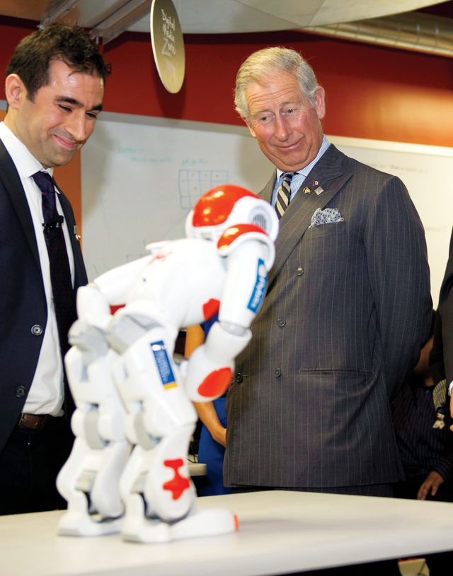 روبوت (أ ف ب)رجل آلي ينحني أمام الأمير تشارلز خلال زيارته جامعة تورنتو في كندا. ويقوم الأمير وزوجته كاميلا دوقة كورنويل بزيارة لكندا بمناسبة اليوبيل الماسي للملكة البريطانية إليزابيث.