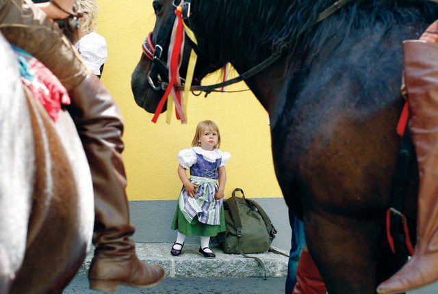فتاة سويسرية صغيرة ترتدي الزي التقليدي، تنظر إلى الخيول أثناء الاحتفالات في قرية فيزتريز آن دير جيل في مقاطعة كارنتيا أمس، وتتركز الاحتفالات السنوية التي ورثها الناس من عادات زراعية من جبال الألب، تعود إلى عام 1630. وتقتضي هذه العادات أن يمتطي الرجال غير المتزوجين الأحصنة، ويضربون برميلاً خشبياً بآلة حديدية حتى يتهشم، وبعد ذلك، يؤدي الرجال رقصة «تحت أشجار الليمون» مع النساء غير المتزوجات.