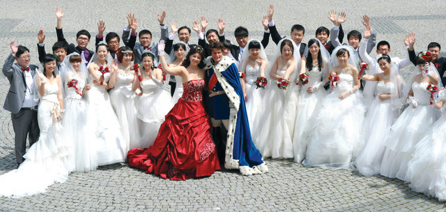 مجموعة من الأزواج الصينيين الذين يقضون إجازتهم في ولاية بافاريا الالمانية أعادوا مراسم فرحهم في حفل تمثيلي حضره ممثلان يرتديان زي حاكم ولاية بافاريا الثاني والإمبراطورة النمساوية سيسي ، الأزواج الصينيون الـ(15 ) الذين تزوجوا في الصين يستعدون لرمي ورودهم فوق الرؤوس في احتفالية تعاهدوا على تكرارها بالزواج في قلعة الملك لودفيغ .