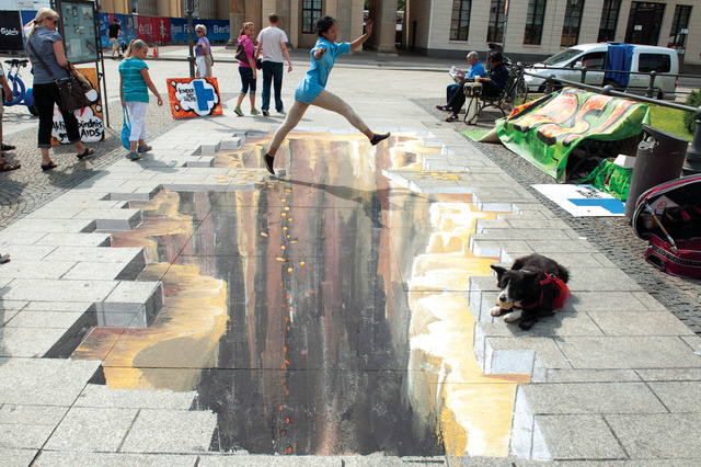 أحد المارة يقفز فوق لوحة هي عبارة عن خدعة بصرية، رسمت في ساحة باريس في مدينة برلين الالمانية ،حيث يظهر للوهلة الاولى أنها حفرة واسعة أقيمت وسط الشارع، وهذا ما جعل المارة يقفزون فوقها من أجل تجاوزها.