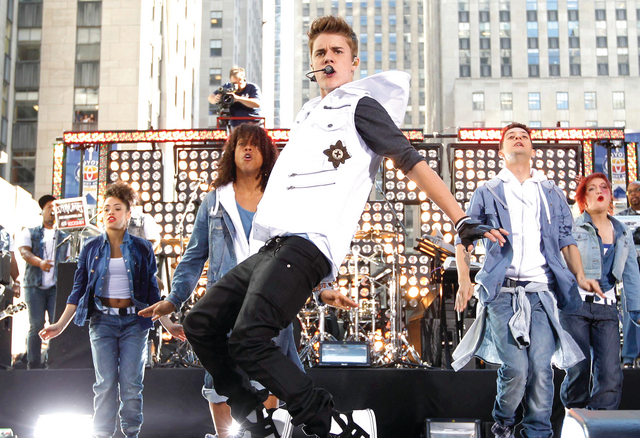عروض في الهواء الطلق (رويترزمغني البوب الكندي جاستن بيبر يؤدي لوحة راقصة يحاكي فيها رقصات مايكل جاكسون. ويحظى هذا الشاب الذي يقدم عروضه في معرض (ان بي سي) في نيويورك بإعجاب كبير في أوساط الشباب والمراهقين في العالم. )