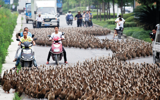 لقطة (رويترز)مزارعون يقودون قطيعاً من البط في قرية تايتشو بمقاطعة تشجيانغ الصينية، حيث يربي القرويون الدواجن ويعتمدون في معيشتهم اليومية على الموارد التي تدرها مبيعاتها في المدن المجاورة .