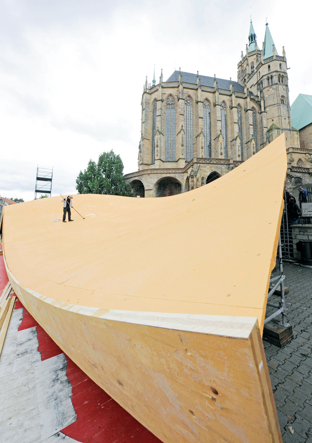 مجسم (أ ب)مجسم عملاق لكثيب رملي، صممه مهندسو مسرح قبالة كاتدرائية مدينة أرفيرت، وسط ألمانيا، استعداداً لعرض أوبرالي مفتوح، سيتحرك الراقصون فيه في أجواء صحراوية وبيئة تحاكي الكثبان الرملية.