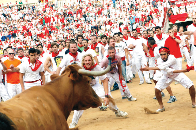 مجموعة من الشباب الإسباني يقفون في وضع قتالي متهكم بمواجهة ثور هائج بمهرجان سان فيرمين في بامبلونا الإسبانية، حيث تجري عملية مطاردة حقيقية مع الثيران الهائجة بين الشوارع والأزقة بالمدينة وغالبا ما تنتهي باصابات جارحة وكسور توصل إلى المستشفى نتيجة التدافع والملاحقة بين الثيران والعدائين بفرح وسعادة تنسي الناس همومهم اليومية.