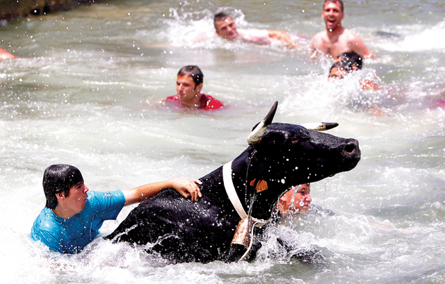 مهرجان (ا ف ب)شاب أسباني يجري حماماً لاحد الثيران في المياه أمس يحيط به عدد من المحتفلين وذلك في مهرجان استحمام الثيران الذي يقام سنويا في ميناء مدينة دينيا الاسبانية التي يتم فيها أستدراج قطعان من الثيران إلى مياه البحر وسط أجواء احتفالية صاخبة.