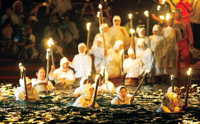 قرويات يحملن المشاعل المضاءة ويدخلن البحر بمناسبة المهرجان السنوي للغطس للسيدات في مدينة شيراهاما في محافظة شيبا على مسافة 100 كيلومتر من العاصمة اليابانية طوكيو.