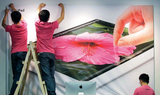 موظف يعلق الملصقات الإعلانية لشركة آبل في مقاطعة ووهان أول من أمس، حيث نظمت الشركة حملة من أجل إطلاق التخفيضات لمنتجاتها الرئيسية. وهي تقوم بزخرفة الصفحة الأولى من جهاز الايباد اللوحي بوردة كبيرة بهدف جذب الجمهور لشراء هذا المنتج الذي ربطته بعاطفة الحب.