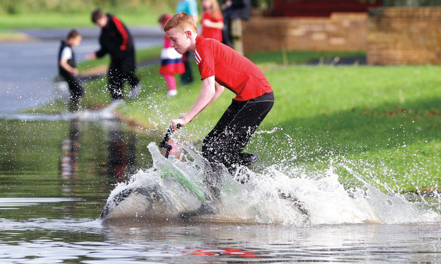 لهو في مياه أمطار هيبرن أ بطفل بريطاني يشق بدراجته عباب الماء، في إحدى ضواحي مدينة هيبرن البريطانية، حيث امتلأت الشوارع بالمياه، من جراء هطل الأمطار التي اجتاحت أجزاء من انجلترا، مشكلة بحيرات صناعية وفسحة للأطفال يمرحون فيها.