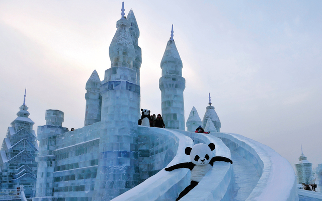 عمارة من جليد رويترزعمارة منحوتة من الجليد في مهرجان هاربين وفي الصورة موظف يرتدي زي الباندا يتزحلق على أسوارها الخارجية بعد أن اكتمل بناؤها خلال المشاركة في مهرجان هاربين الدولي للجليد بمقاطعة هيلونغجيانغ الصينية أمس.